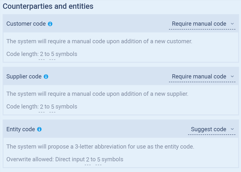 Counterparties and entities – Set rules for customer, supplier, and entity abbreviations.