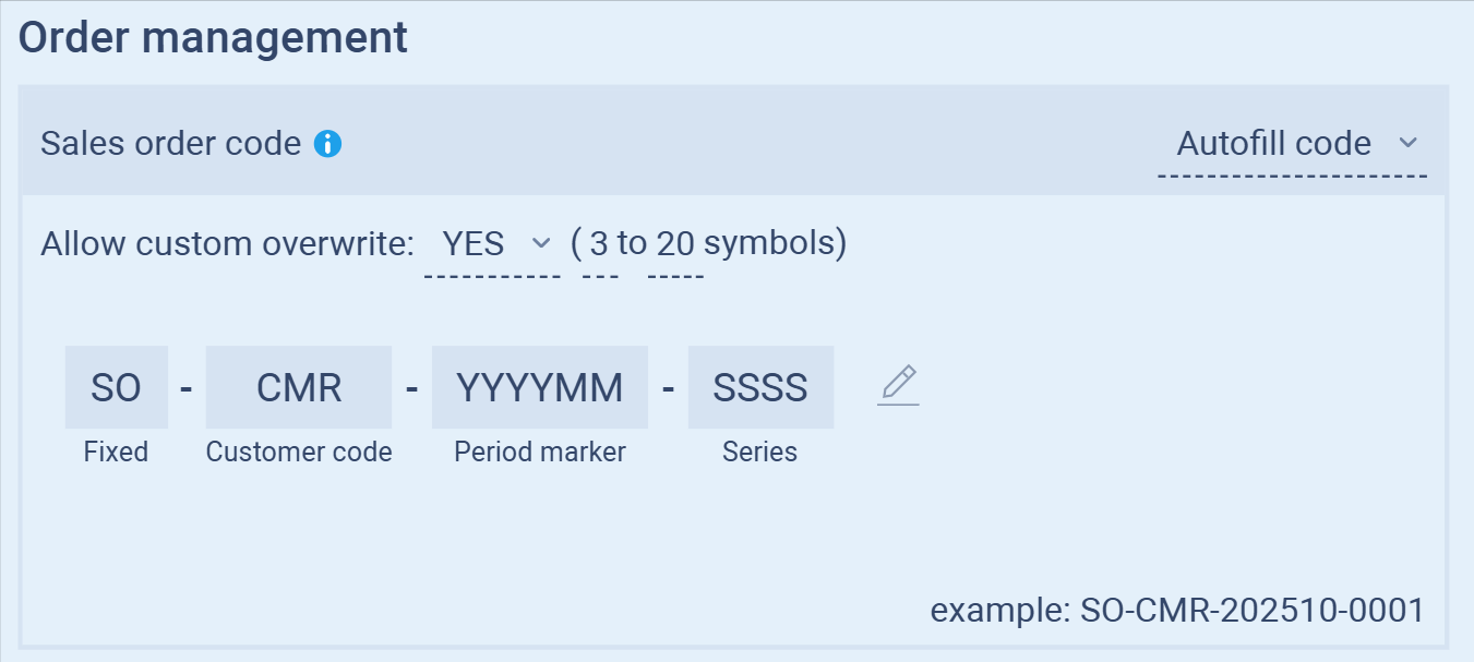 Under Sales order code, adjust the following options:
