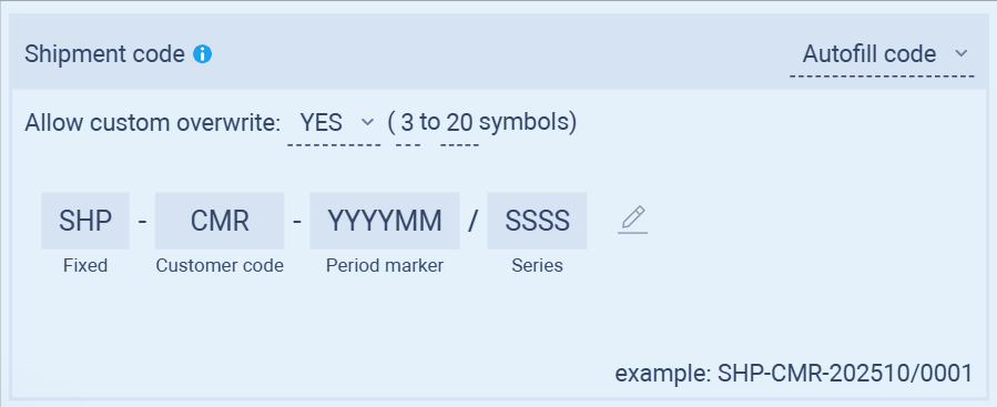 Allow custom overwrite: Choose YES if you want to manually edit shipment codes when necessary.