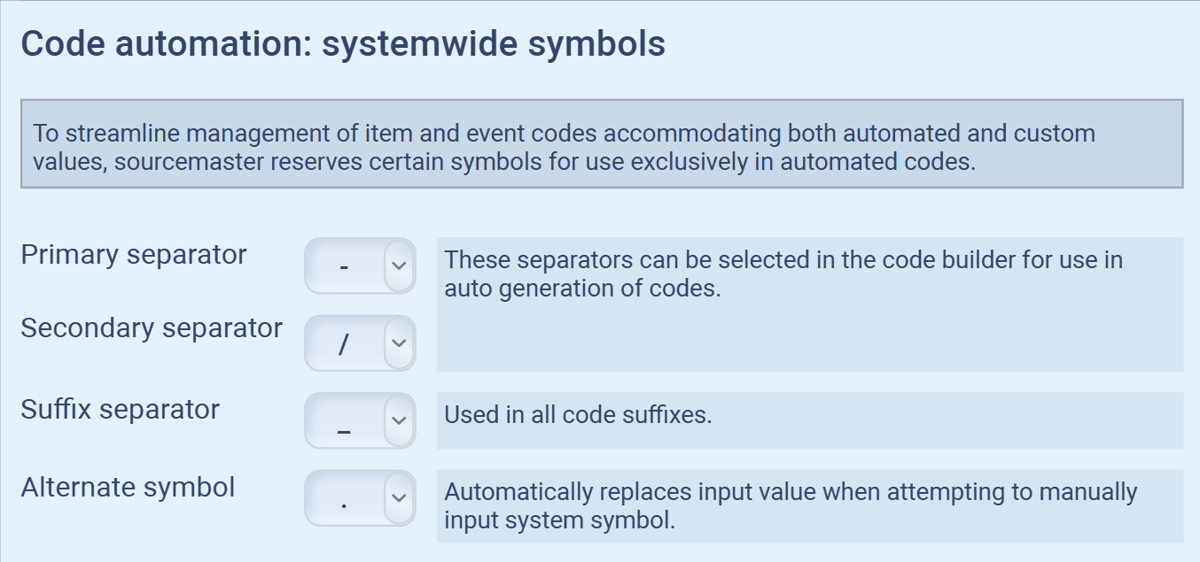 In sourcemaster, systemwide symbols define how codes are automatically structured across all modules (orders, products, entities, etc.).