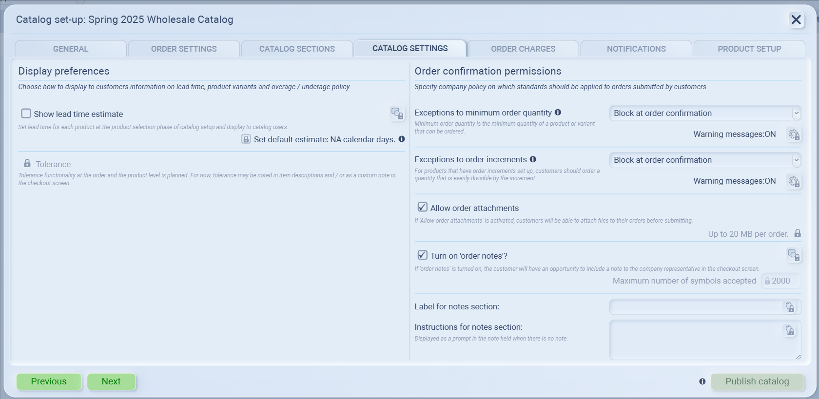 This tab controls how your catalog behaves when customers place orders.