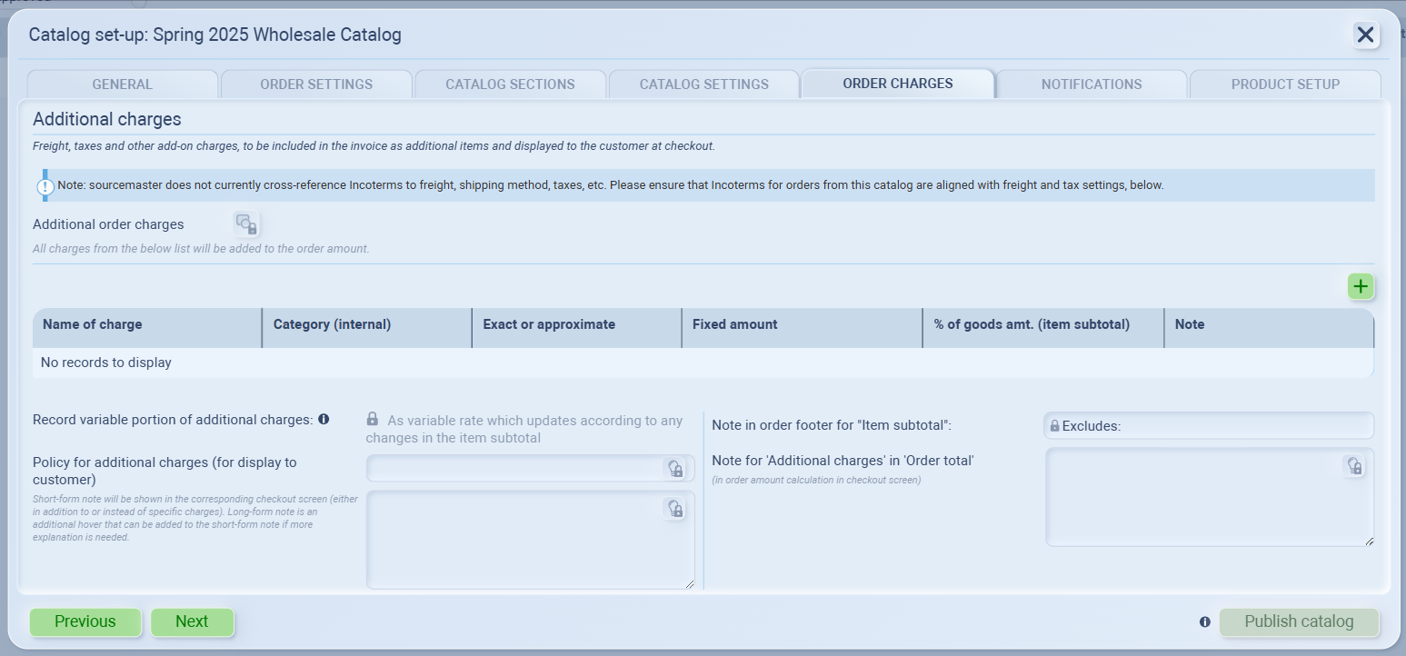 Make sure your freight, shipping, and tax policies align with the catalog’s Incoterms configuration.