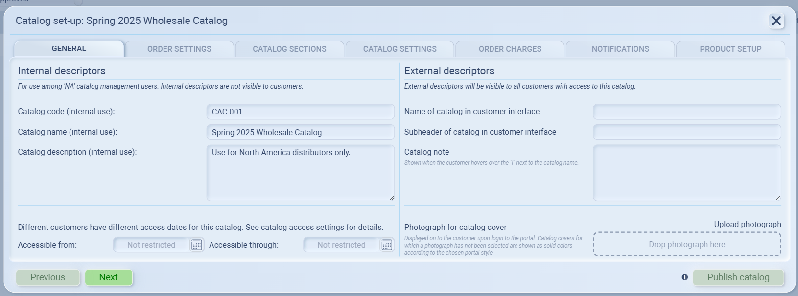This is where you define your new catalog’s internal details before publishing it to customers.