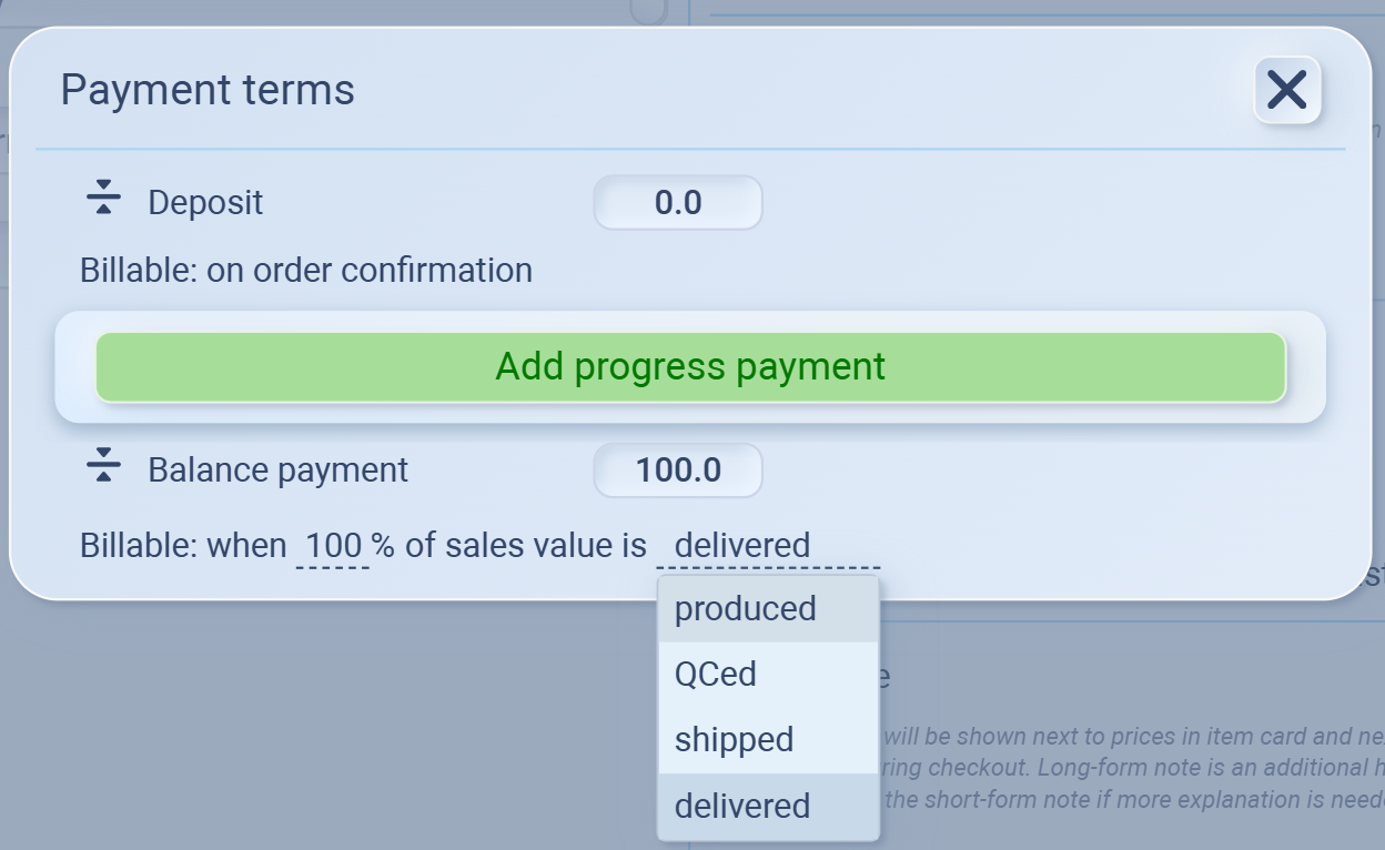 You might set 30% deposit on order confirmation, 50% progress payment after production starts, and 20% balance billable when the entire order is delivered.