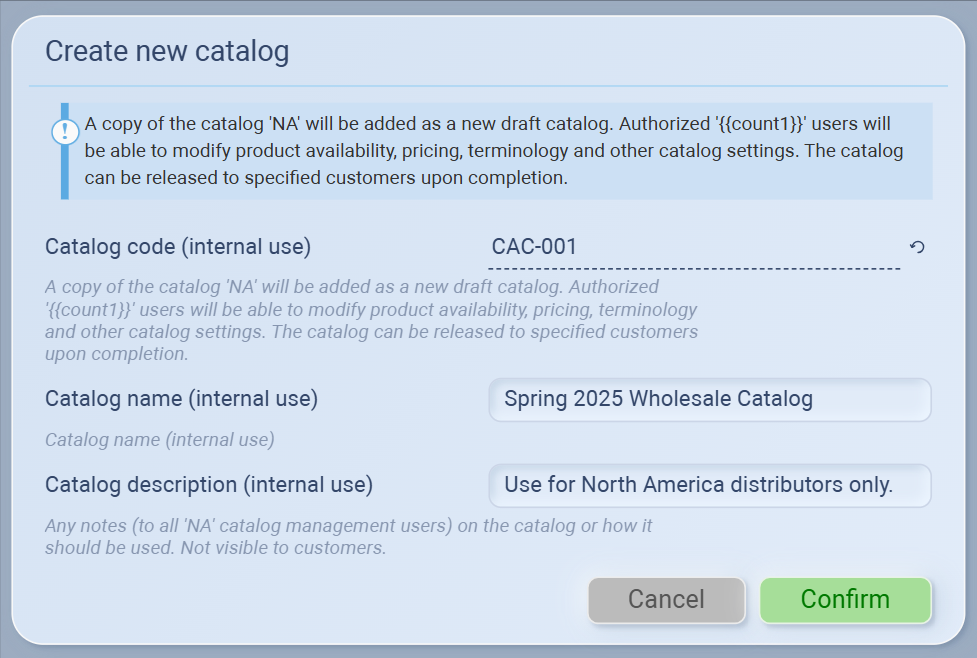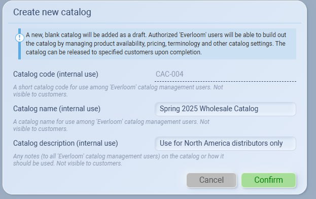 Click Confirm to save the new catalog. It will appear as a Draft in your Catalogs list and can now be edited or released to specific customers.