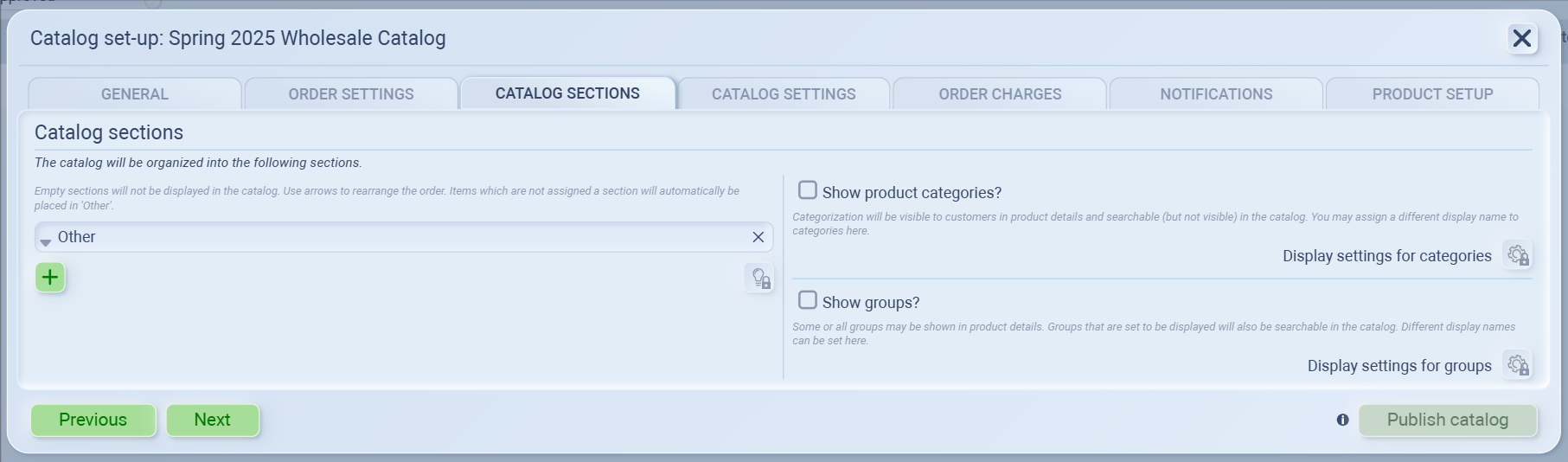 💡 Tip: Think of “sections” as the front-end layout of your catalog, while “categories” and “groups” come from your product database.