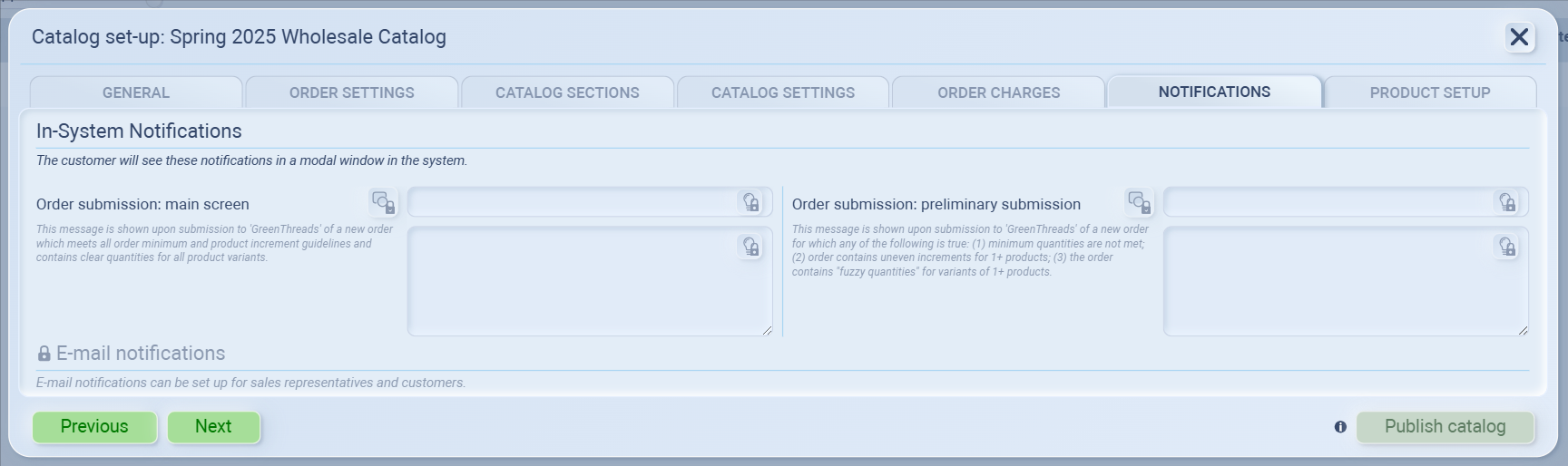 Notifications let you control the messages your customers see when submitting orders through the portal.