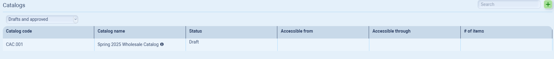 | Catalog name (internal use) | A short name used internally to describe the catalog. Not visible to customers. | Spring 2025 Wholesale Catalog |