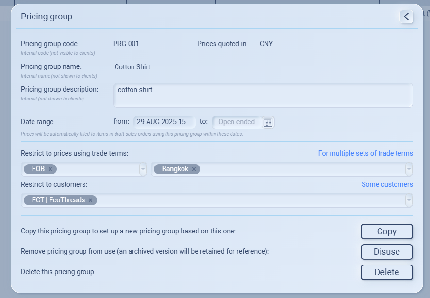 This gives you full flexibility to control who can use the pricing group, under what terms, and for how long.