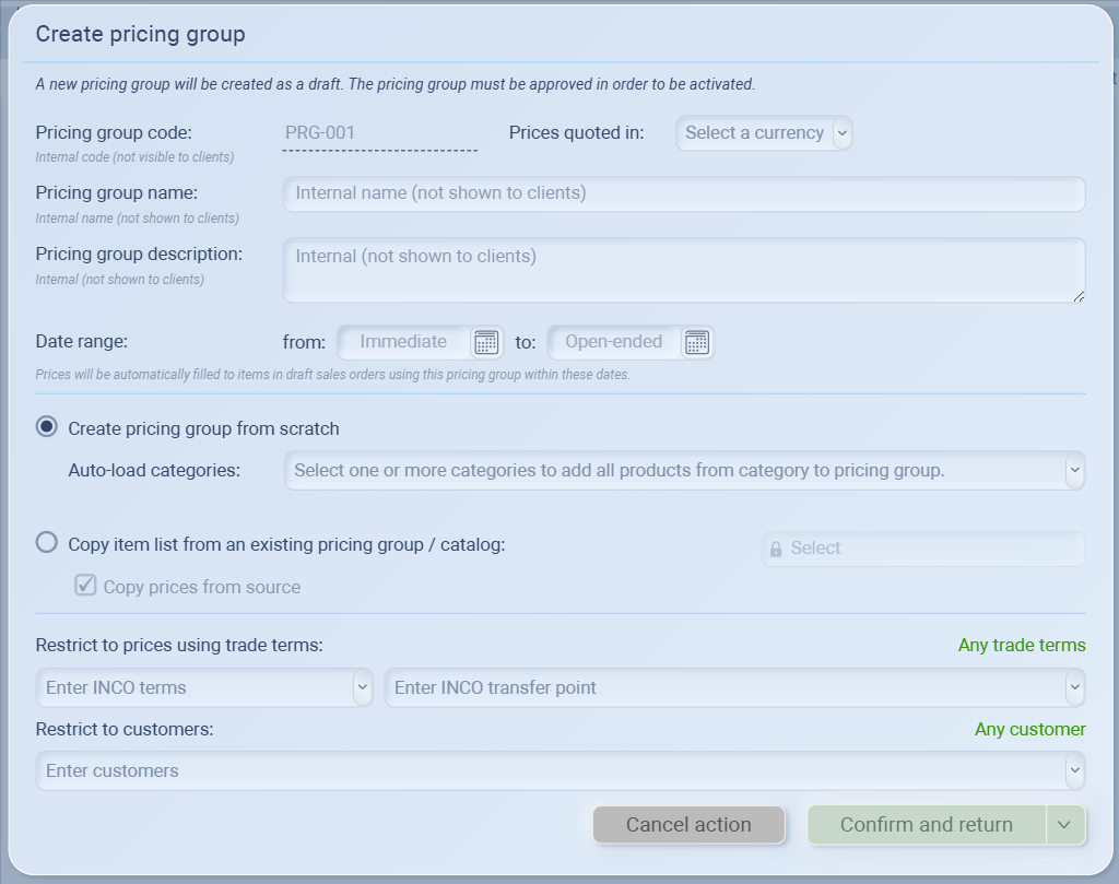 Click Confirm and return to save your pricing group as a draft.