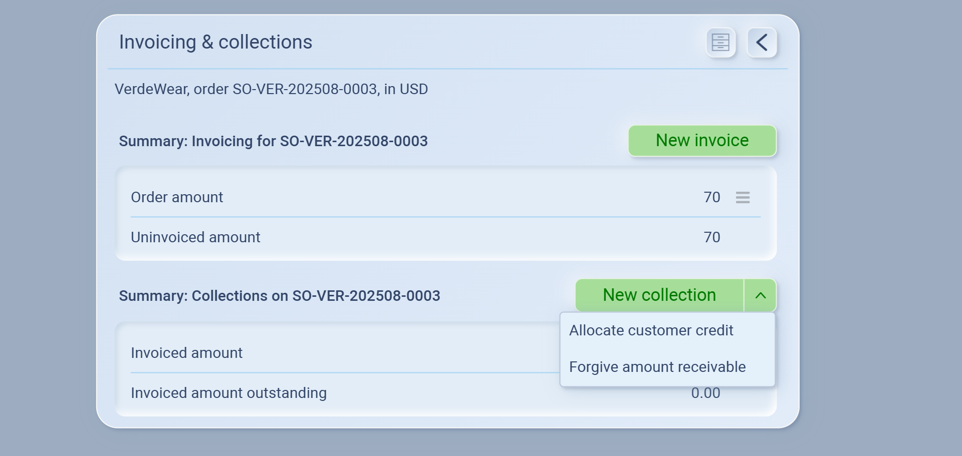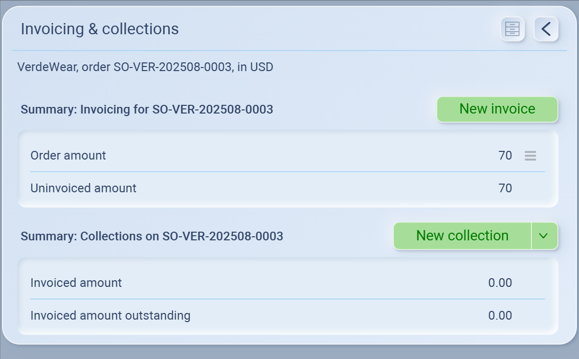 Inside the order’s Invoicing & Collections window you’ll find: