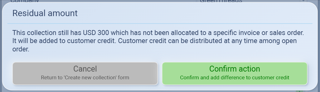 If you skip allocating the payment to a sales order, the system will prompt:“This collection still has USD [amount] which has not been allocated. It will be added to customer credit.”