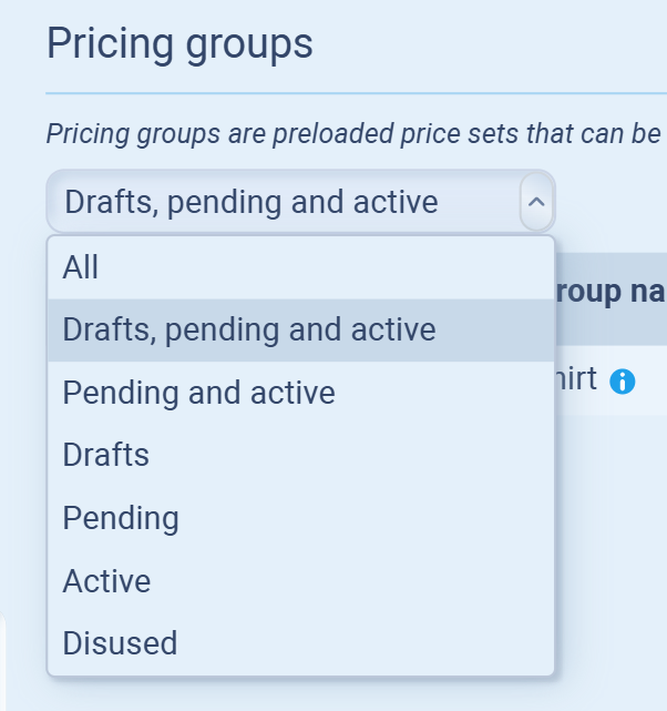 You can filter pricing groups by their status using the dropdown menu: