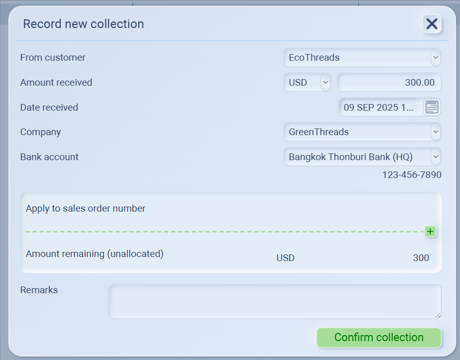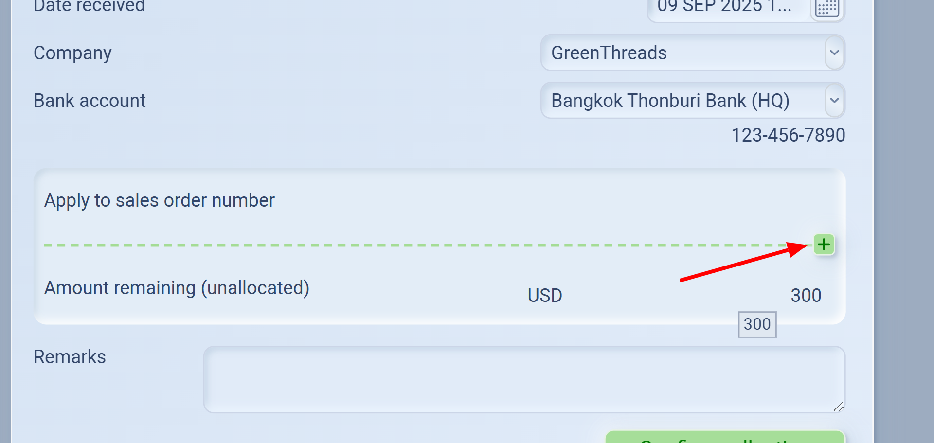 Apply the payment to the correct Sales Order number by clicking + under “Apply to sales order number”.