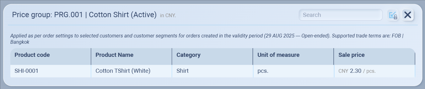 Restrict by trade terms: Limit the group to specific trade terms (e.g., FOB | Bangkok).