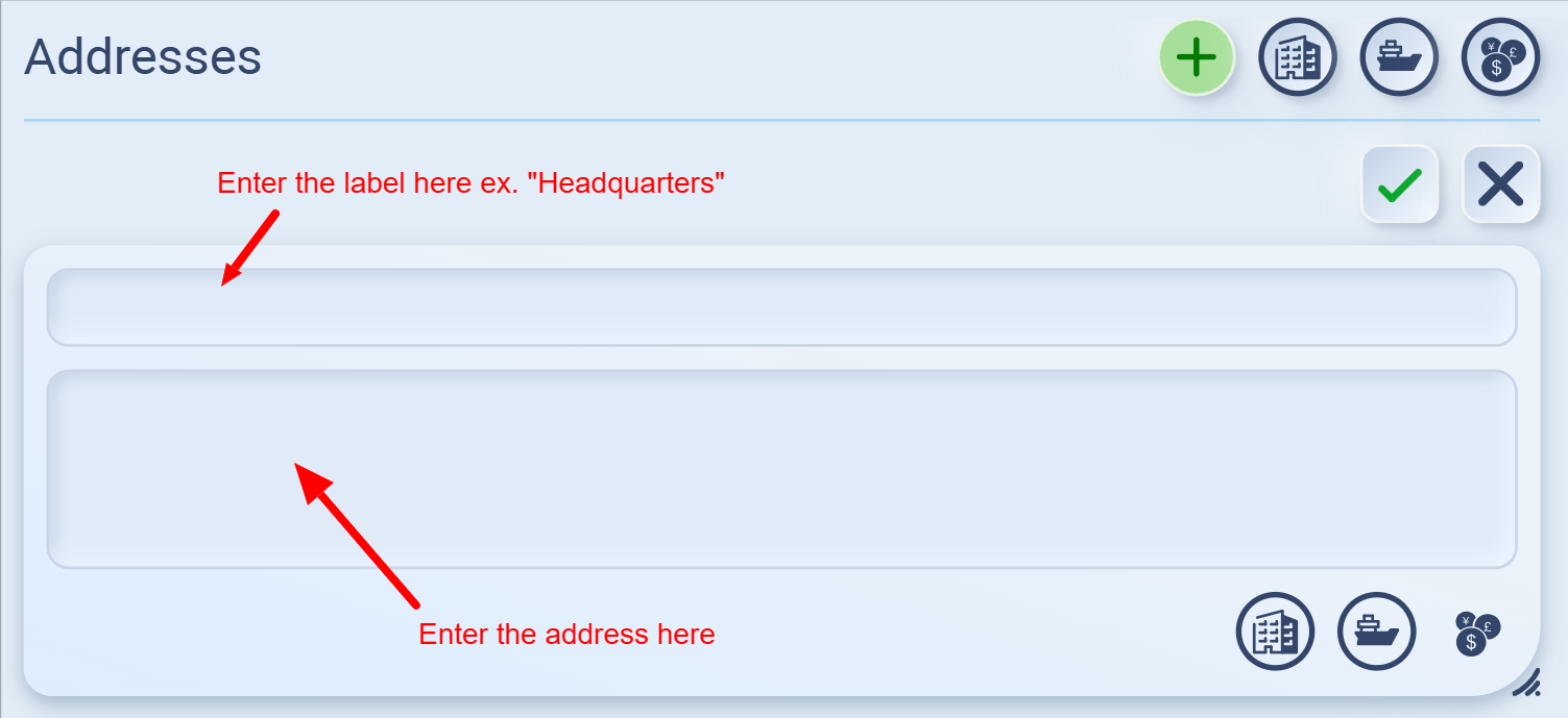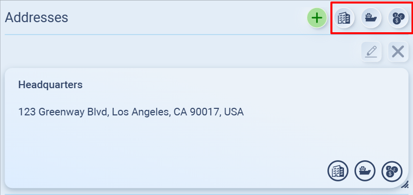 For example, if you set your headquarters address and circle the 🏢 icon, it will be recognized as the Legal Address. You can also tag the same address as 🚢 (Shipping) and 💰 (Billing) if it serves multiple purposes.