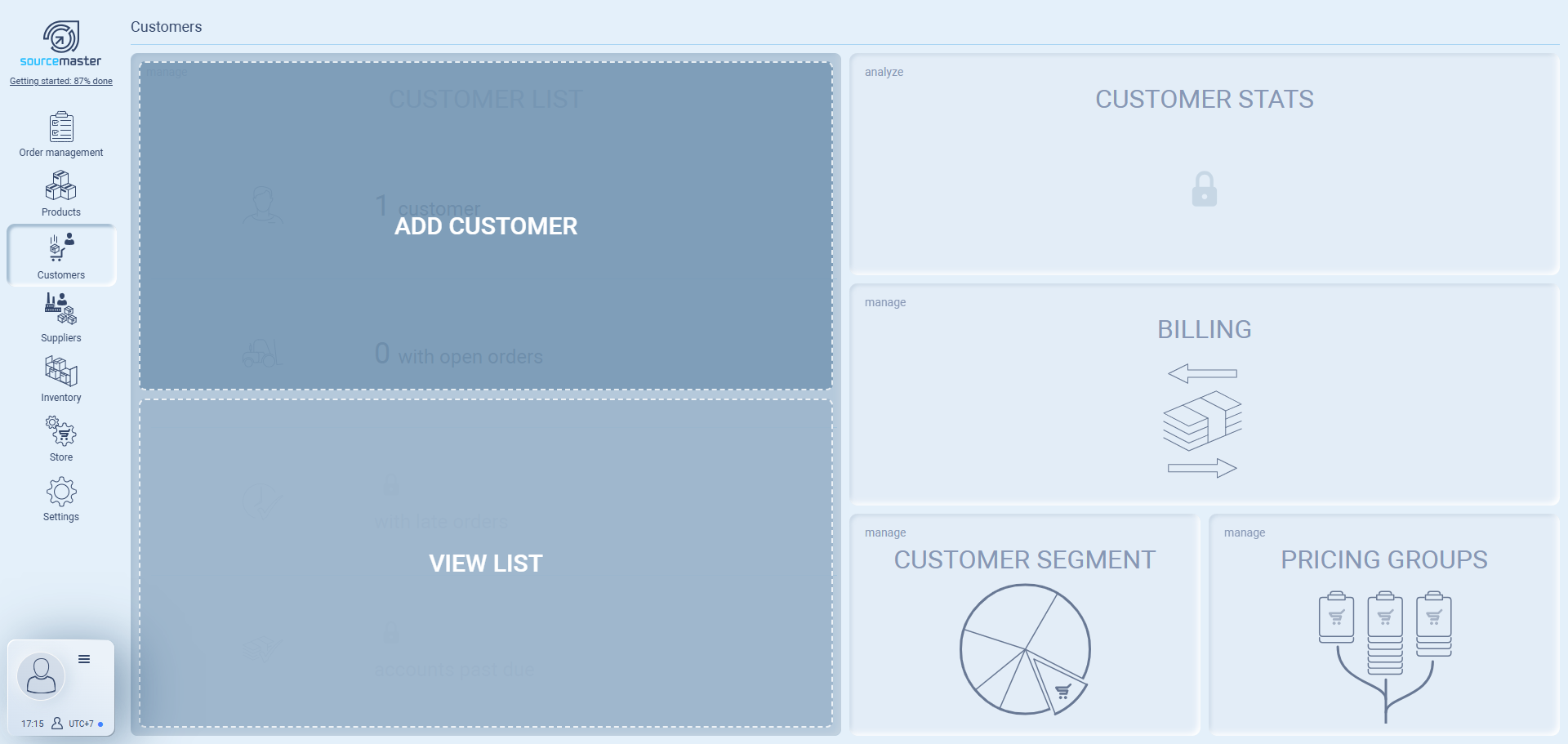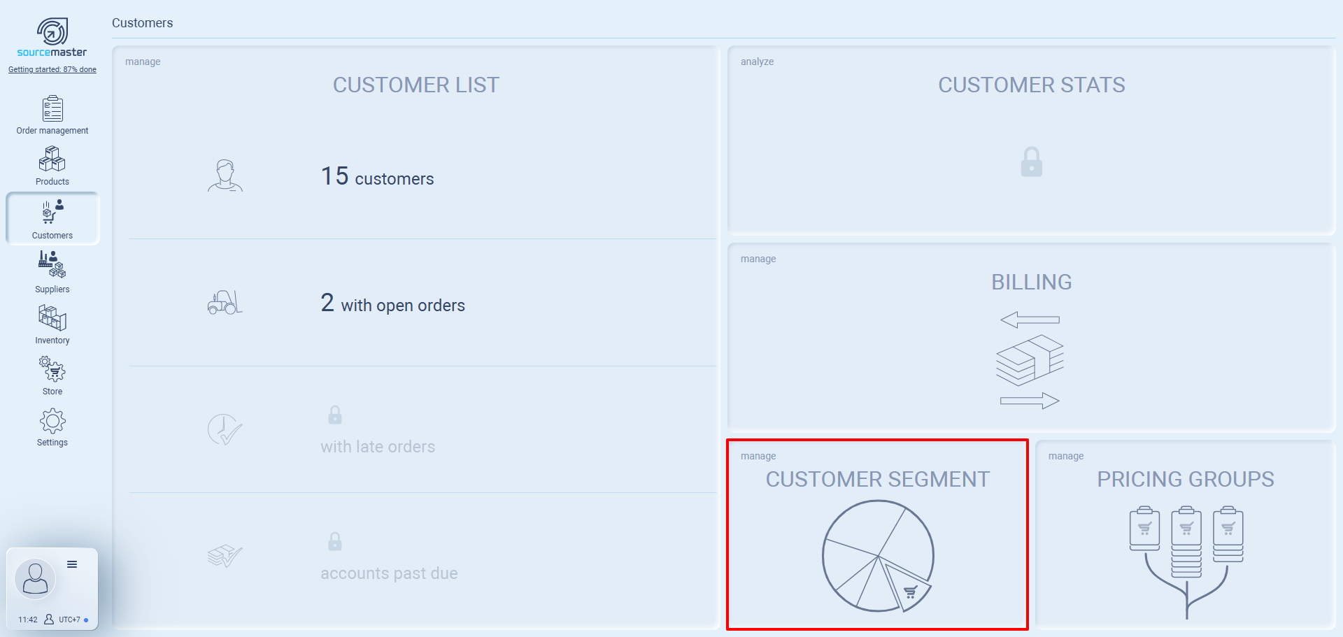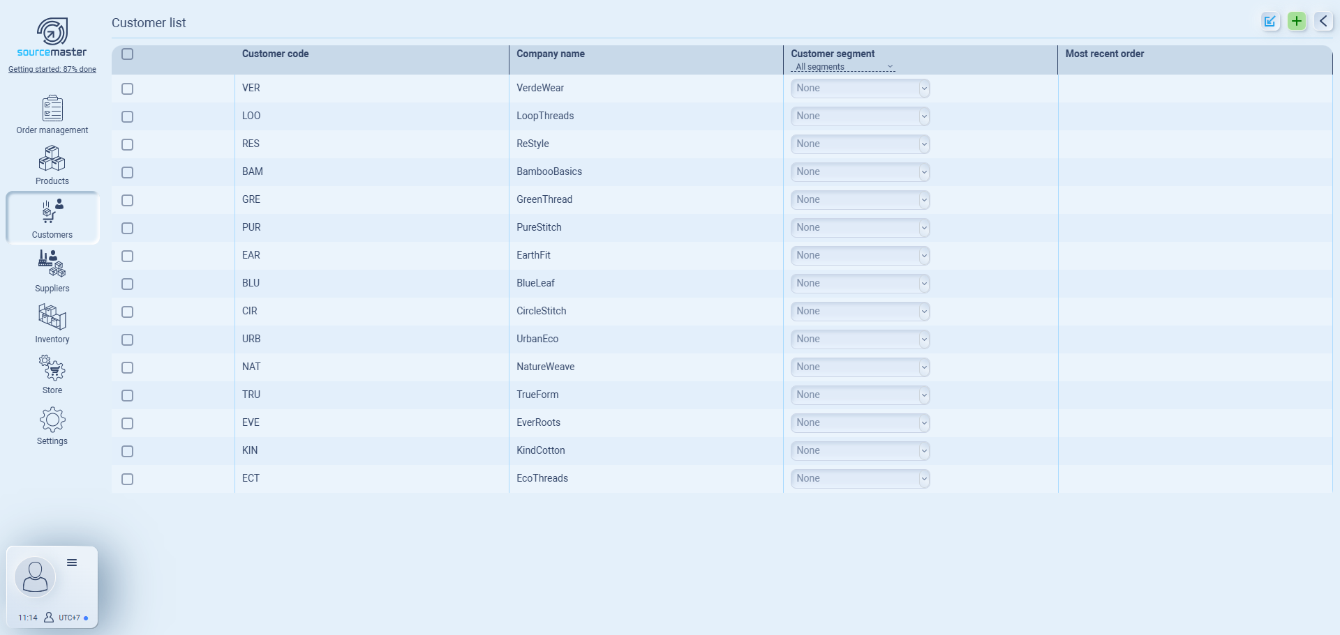 The Customer List is where all of your registered customers (companies) are displayed. Each entry shows the customer code, company name, segment (if assigned), and their most recent order.