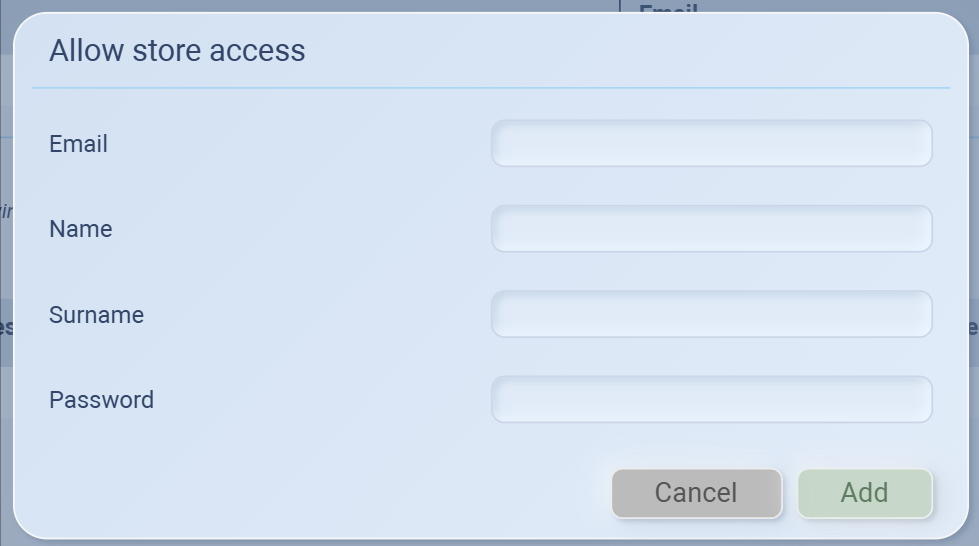 To add: click the ➕ Add button, enter their Name, Surname, Email, and a temporary Password, then share that password with them so they can log in. (and don't forget to click Add to confirm)