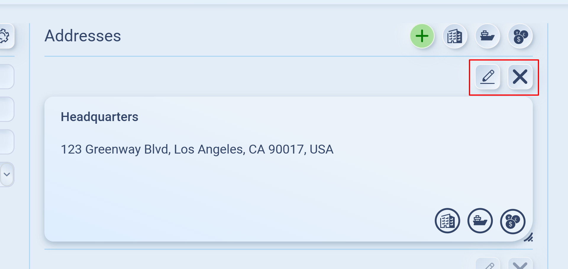 At the top-right of the Addresses section, you’ll also find filter buttons. Clicking these icons lets you quickly filter and view only addresses of a specific type (Legal, Shipping, or Billing).