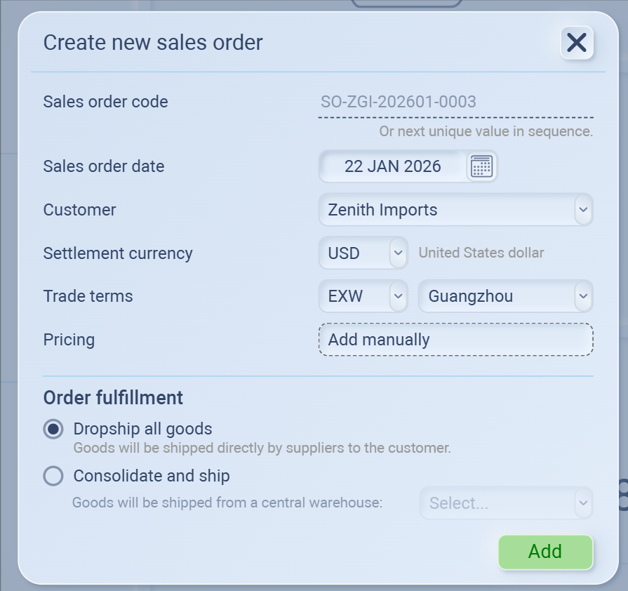 Add manually – Enter order pricing directly (customized per deal).
