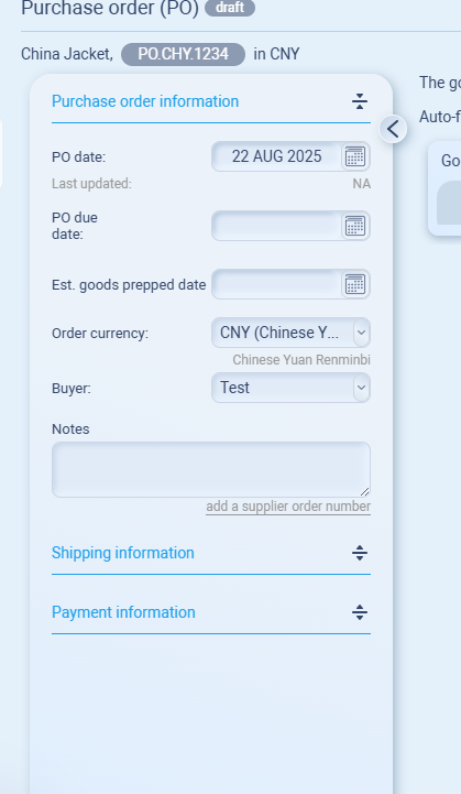 Tip: Fill PO due date + Est. goods prepped date for realistic timelines and better late/early reporting.