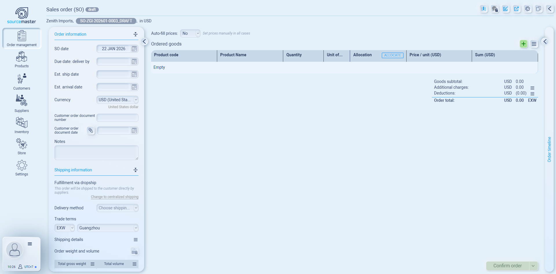 Order code, date, seller, customer, currency, trade terms, pricing, and fulfillment.