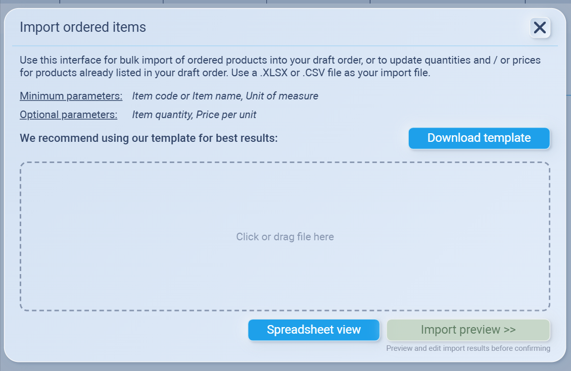 Import items (XLSX/CSV) – bulk add lines.