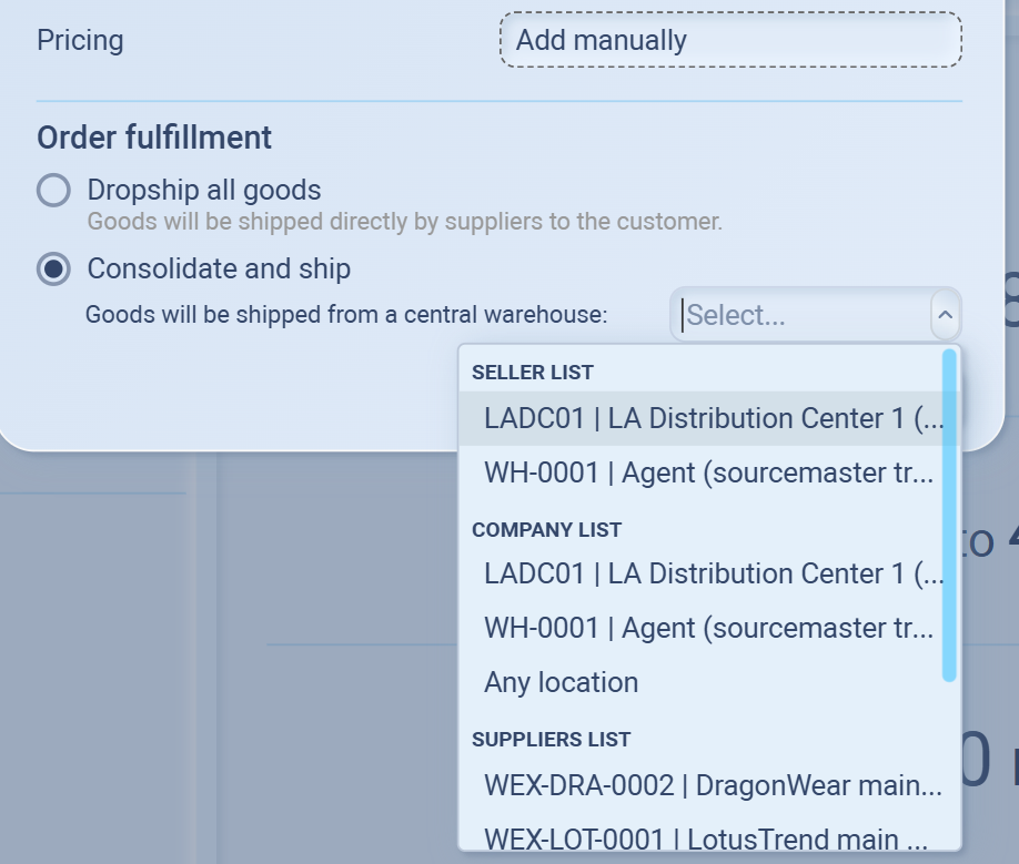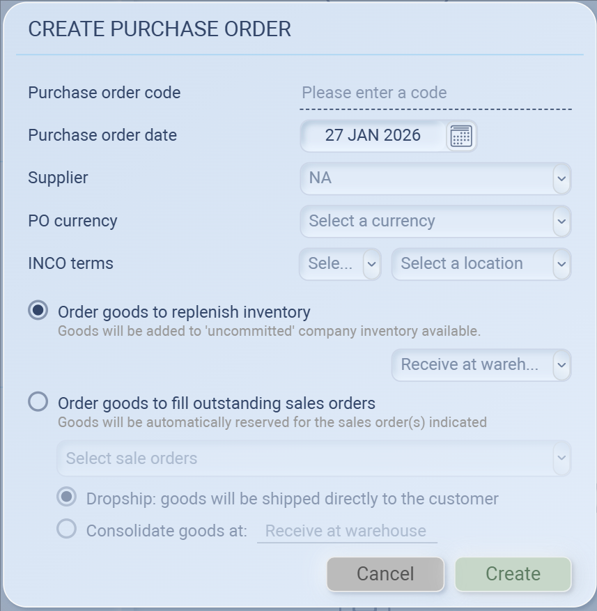 Fill outstanding sales orders → you’ll be able to pick the Sales Order(s) and choose Dropship (supplier → customer) or Consolidate (supplier → your warehouse → customer).