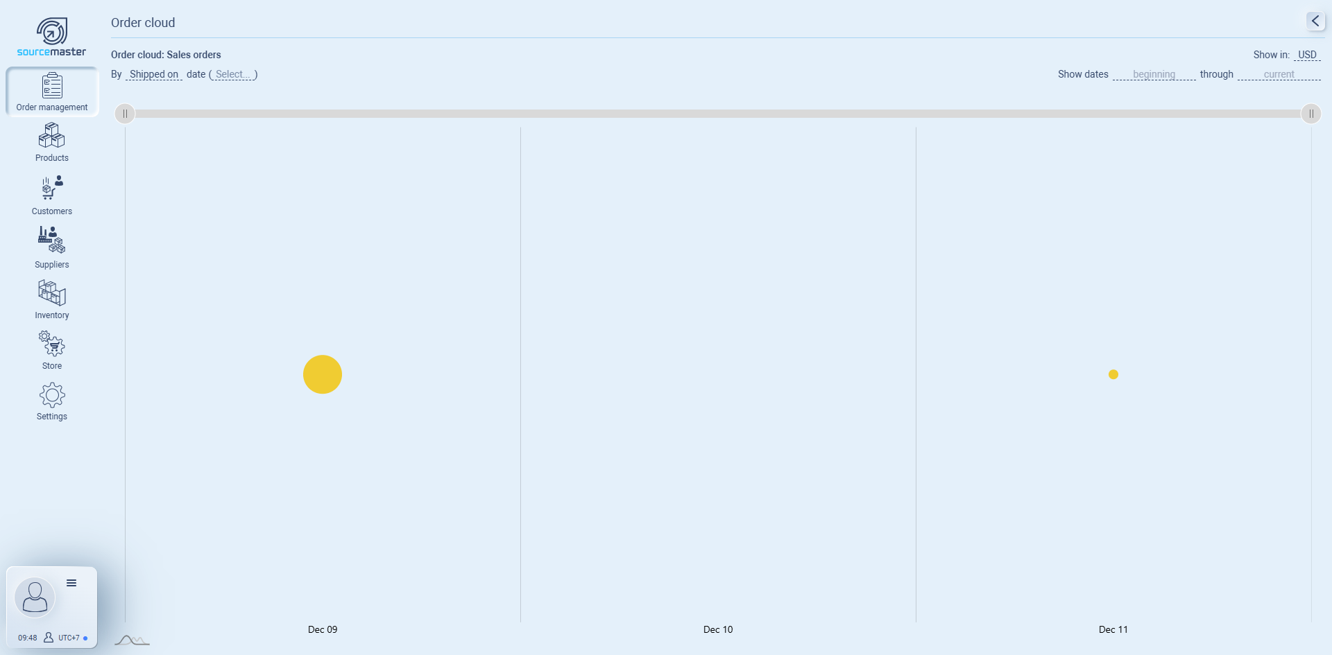 Order cloud (each order as a dot—size & timing)