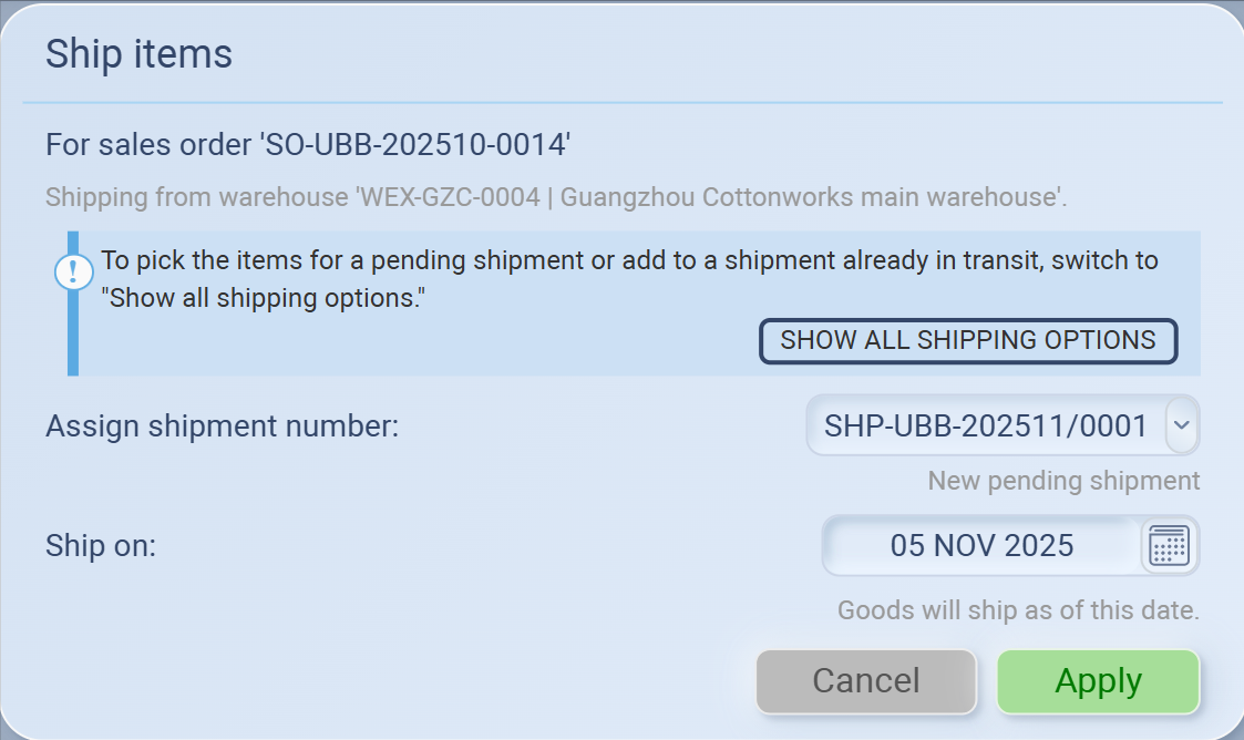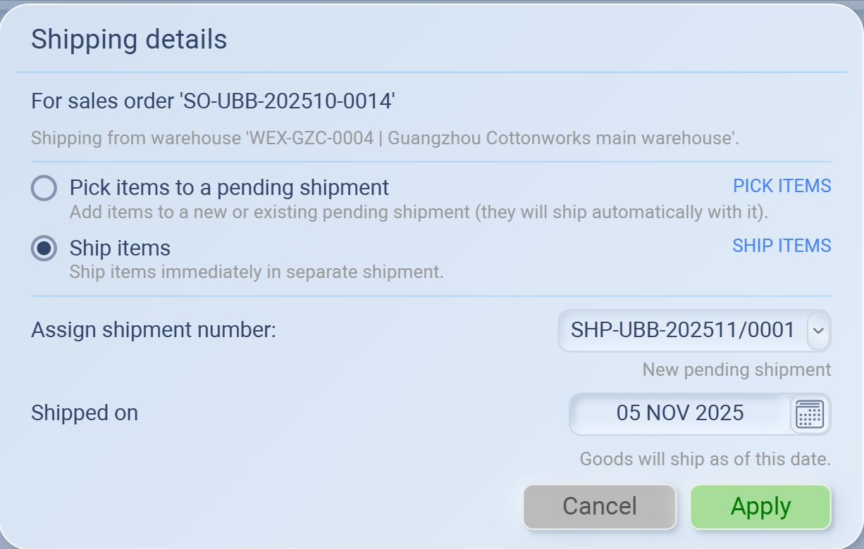This is where you confirm how and when the shipment will be created.By default, the system selects Ship items, meaning the goods will be shipped immediately in a new shipment record.