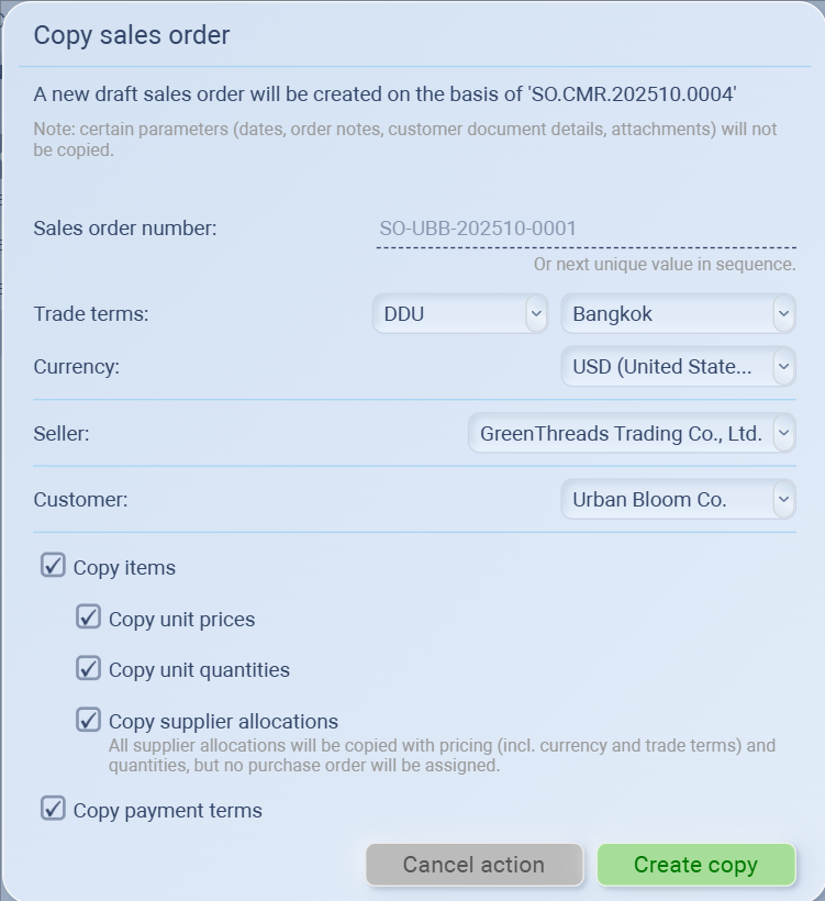 This will open the Copy Sales Order window, where you can choose what details to include: