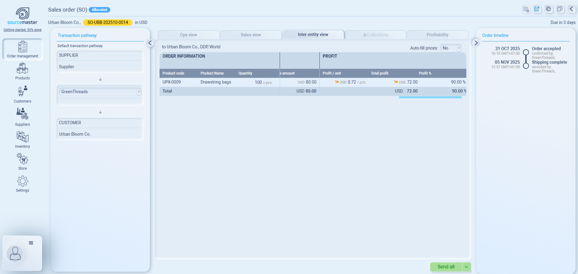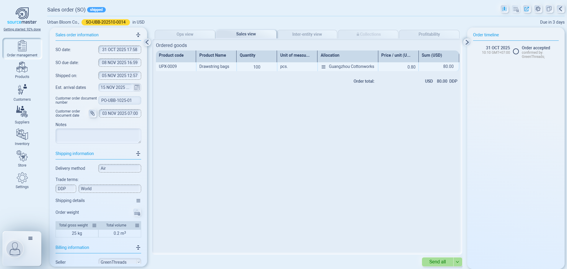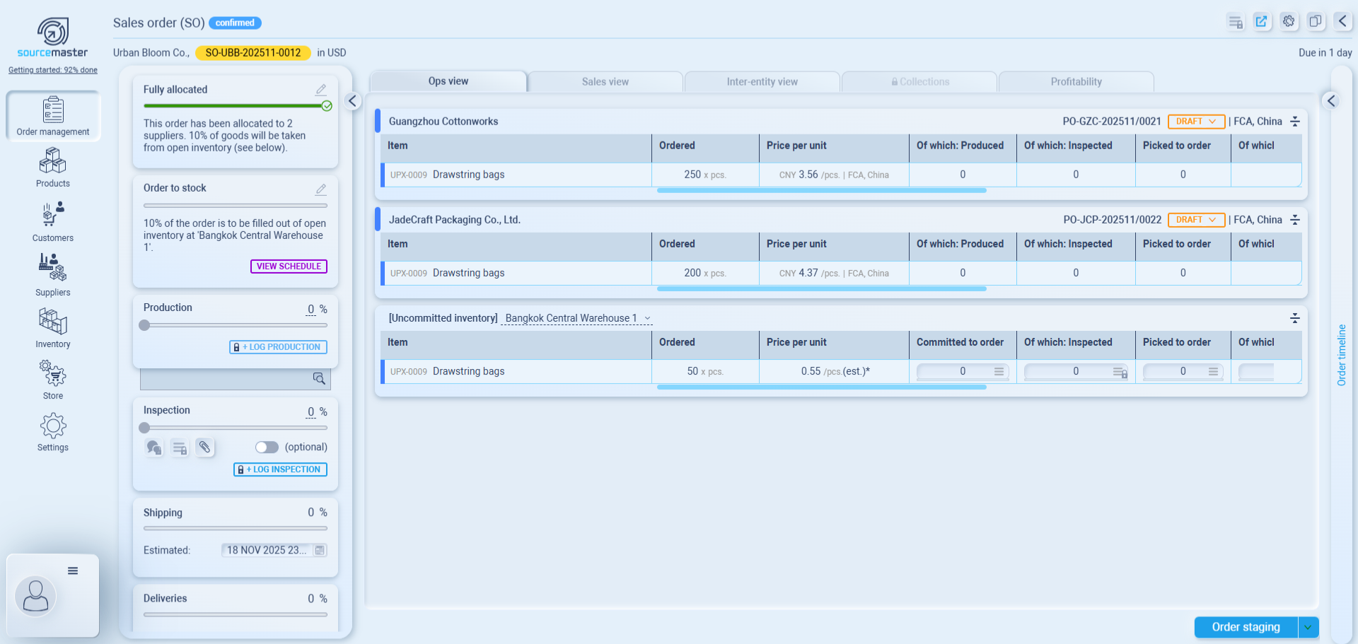 In Sourcemaster, the Sales Order (SO) brings everything together — your customer’s request, the items you need to source, and the suppliers involved. You’ll consolidate all items at your warehouse first, then ship everything out in one combined delivery.