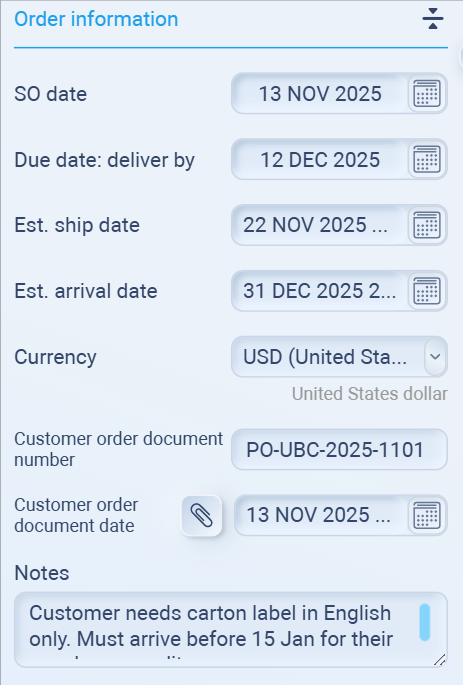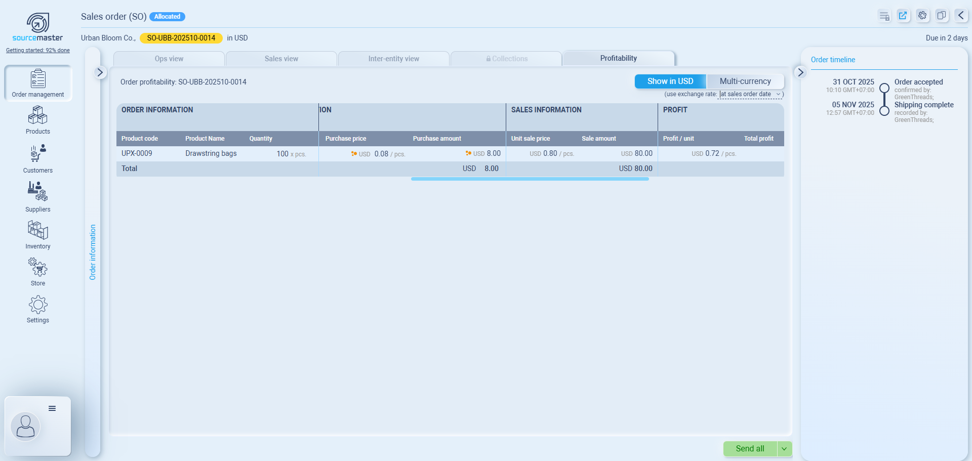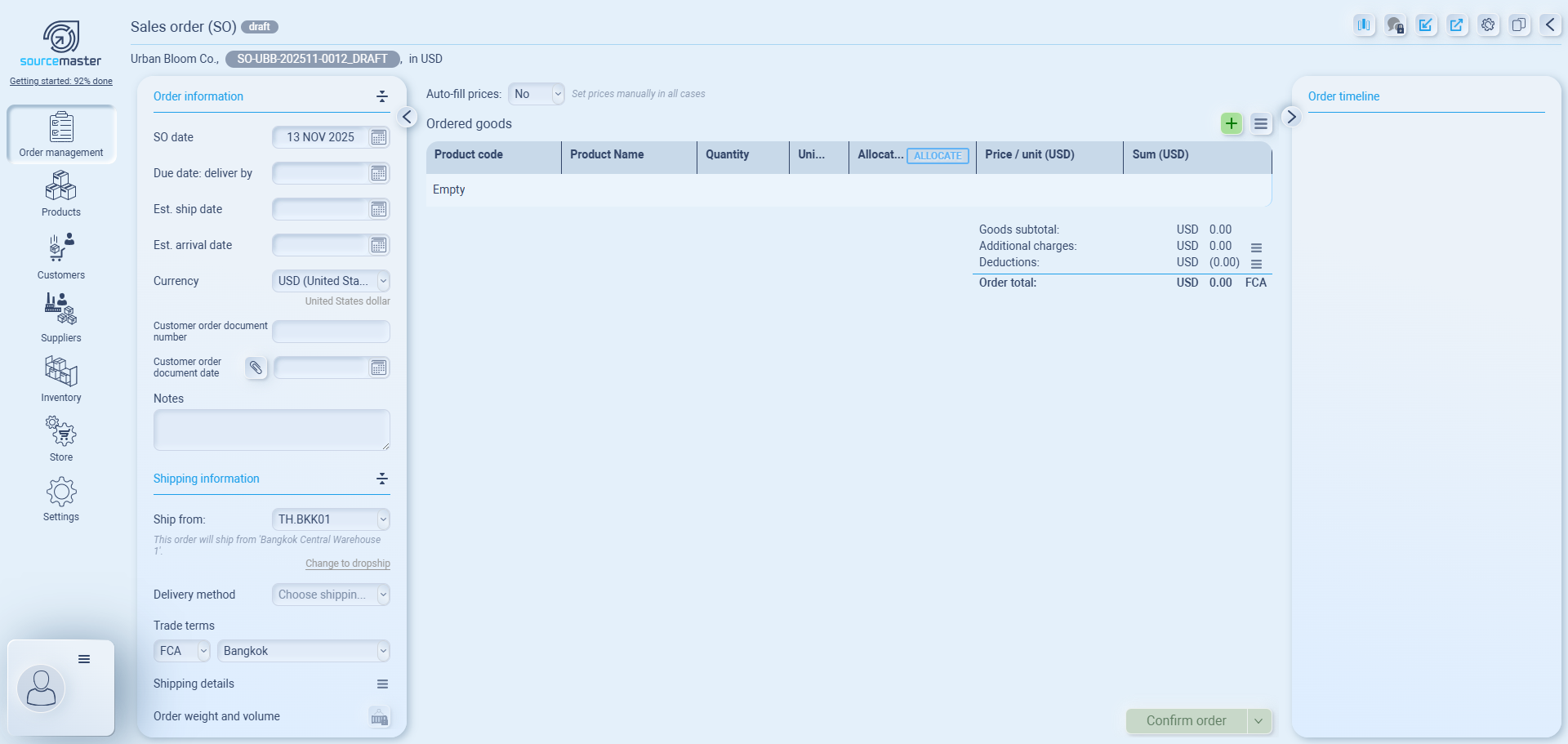 In Sourcemaster, the Sales Order (SO) brings everything together — your customer’s request, the items you need to source, and the suppliers involved. You’ll consolidate all items at your warehouse first, then ship everything out in one combined delivery.