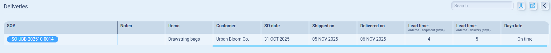 Once the shipment is marked Delivered, the Sales Order (SO) will automatically move out of the active “Sales Orders” list and appear under the Deliveries section instead.