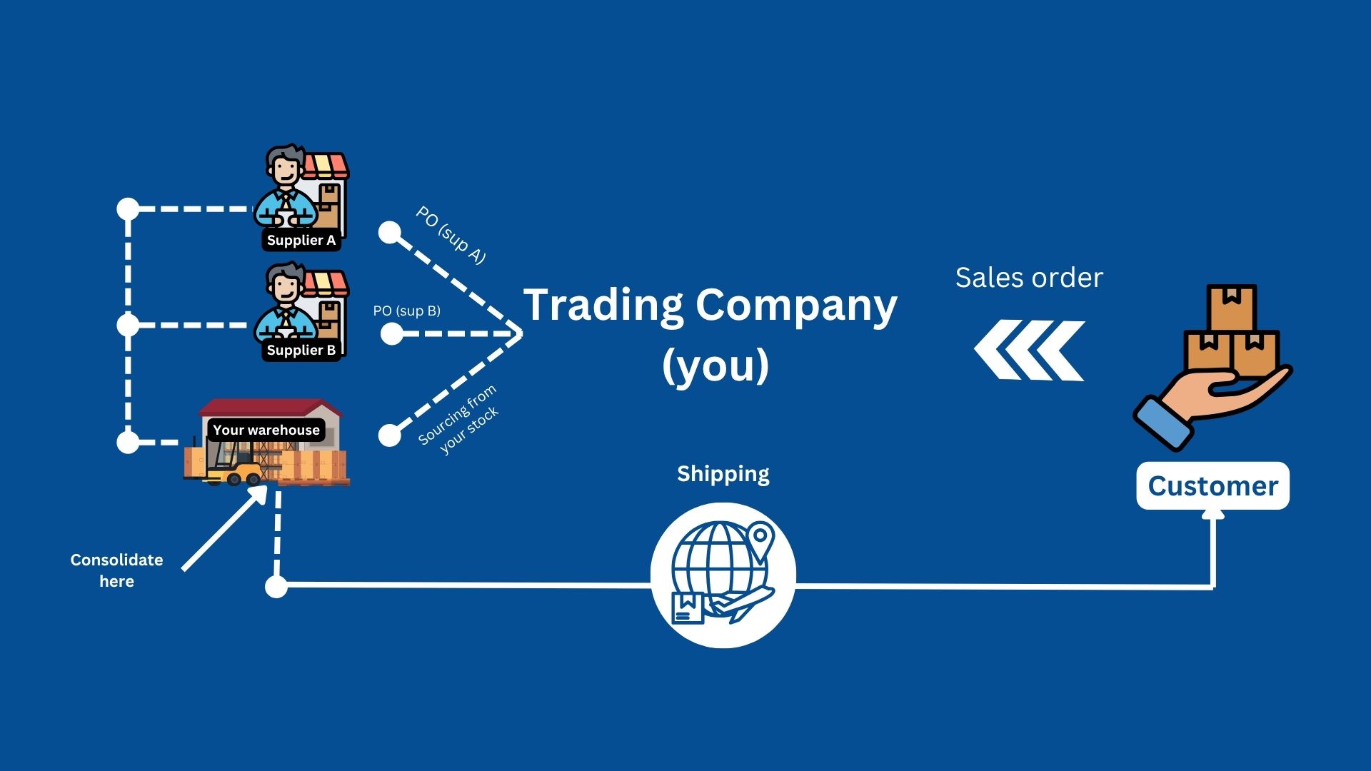 You will handle consolidation in this workflow — items come in from multiple suppliers (and your own stock), get gathered at your warehouse, and ship out as one final delivery to the customer.