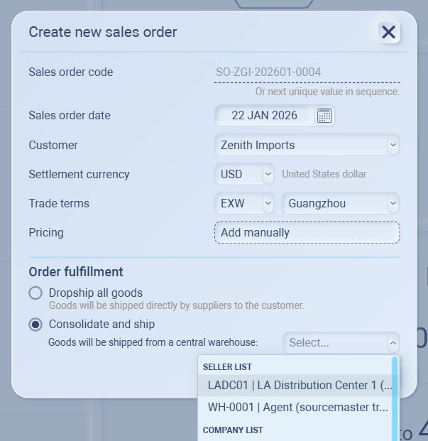 Since the goods will be collected from multiple sources and shipped out together from your warehouse, this case uses the Consolidate and ship fulfillment type (and select your warehouse).