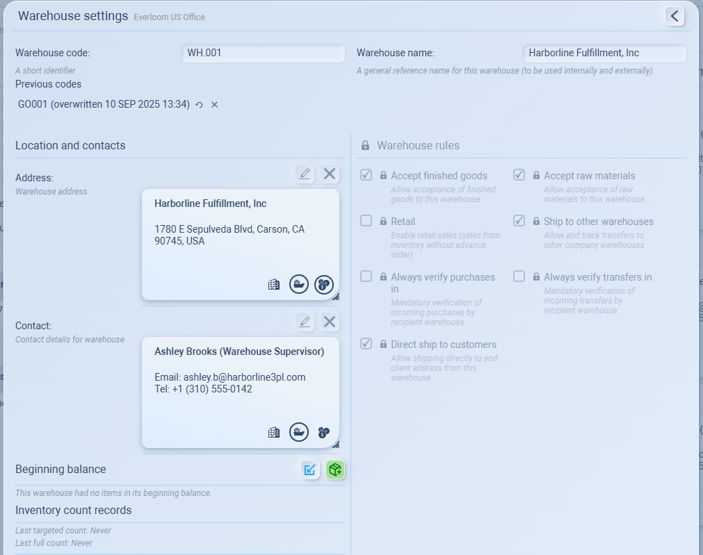 - Warehouse Name: a clear reference name (e.g., Harborline Fulfillment, Inc.).